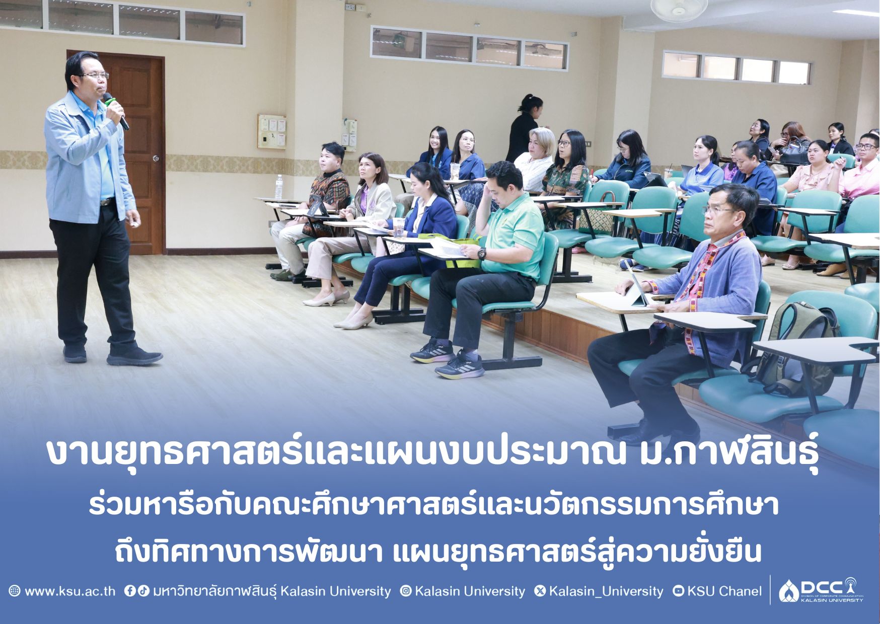 วันพุธที่ 17 กันยายน 2568 เวลา 13.30 น. ณ ห้องแพรวา ชั้น 3 อาคารเรียนรวม คณะศึกษาศาสตร์และนวัตกรรมการศึกษา มหาวิทยาลัยกาฬสินธุ์ (พื้นที่นามน) คณะทำงานยุทธศาสตร์และแผนงบประมาณ มหาวิทยาลัยกาฬสินธุ์ นำโดย ดร.ศักดิ์เกษม ปานะลาด รองอธิการบดีมหาวิทยาลัยกาฬสินธุ์ พร้อมด้วยนางธันยกร นรภาร ปฏิบัติหน้าที่ผู้อำนวยการกองนโยบายและแผน เข้าพบปะผู้บริหาร คณาจารย์ และบุคลากร คณะศึกษาศาสตร์และนวัตกรรมการศึกษา